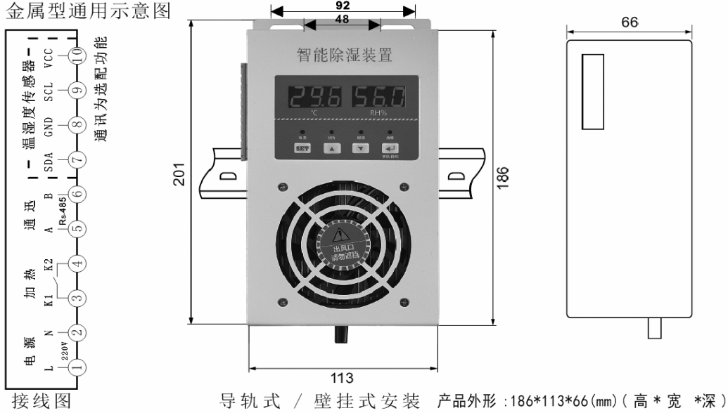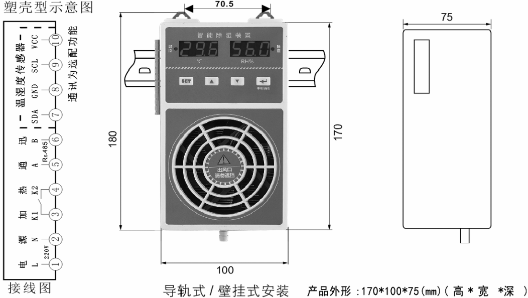產(chǎn)品簡介 / Introduction概述:智能型除濕裝置是采用半導(dǎo)體制冷除濕方式,主動將密閉空間的潮濕空氣在風(fēng)扇的作用下吸入除濕風(fēng)道,空氣中的水汽經(jīng)過半導(dǎo)體制冷機(jī)構(gòu)后冷凝成水,再通過導(dǎo)水管排除柜體,可以達(dá)到很好的除濕效果。降溫型:當(dāng)F01設(shè)置0時為降溫型,當(dāng)環(huán)境濕度高于濕度最大值(濕度設(shè)定值)期間除濕裝置會自動開啟除濕;當(dāng)環(huán)境濕度低于濕度最低值(濕度設(shè)定值減去濕度回差值)停止除濕。當(dāng)環(huán)境溫度高于設(shè)定溫度最高值(溫度設(shè)定值),風(fēng)扇散熱開始啟動,當(dāng)溫度低于設(shè)定溫度值(溫度設(shè)定值減去溫度回差值)降溫風(fēng)扇停止工作。升溫型:當(dāng)F01設(shè)置1時為升溫型,當(dāng)環(huán)境溫度低于設(shè)定溫度最低值(溫度設(shè)定值),加溫開始啟動,當(dāng)溫度高于最高溫度值(溫度設(shè)定值加上溫度回差值)加溫停止。如同時需冷凝除濕,設(shè)置濕度值,當(dāng)環(huán)境濕度高于設(shè)定濕度最大值(濕度設(shè)定值)期間除濕裝置會全自動開啟除濕;當(dāng)環(huán)境濕度低于濕度最低值(濕度設(shè)定值減去濕度回差值)停止除濕;當(dāng)手動開啟除濕功能時,除濕裝置將一直保持除濕功能,直至手動關(guān)閉除濕功能。防結(jié)霜結(jié)冰功能:實(shí)時監(jiān)測冷凝面工作面溫度,防止冷凝面溫度過低在除濕工作的時候結(jié)冰結(jié)霜,影響排水效果空氣循環(huán)功能:柜內(nèi)空氣靜止?fàn)顟B(tài)下各個部位的溫度不同濕度不同,除濕器提供柜內(nèi)空氣循環(huán)功能,使柜內(nèi)各個方位的溫度濕度更加平均,能更加有效的監(jiān)測柜內(nèi)空氣中的濕度和環(huán)境溫度。技術(shù)參數(shù):