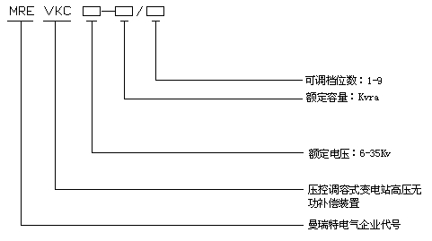 4、由于調(diào)壓過程電容器始終不脫離電網(wǎng),無需充放電延時,因此可相對提高無功補償?shù)母櫵俣取?br /> 型號說明